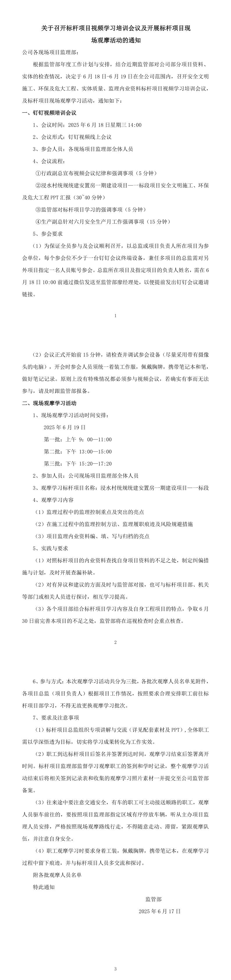 关于召开标杆项目视频学习培训会议及开展标杆项目现场观摩活动的通知