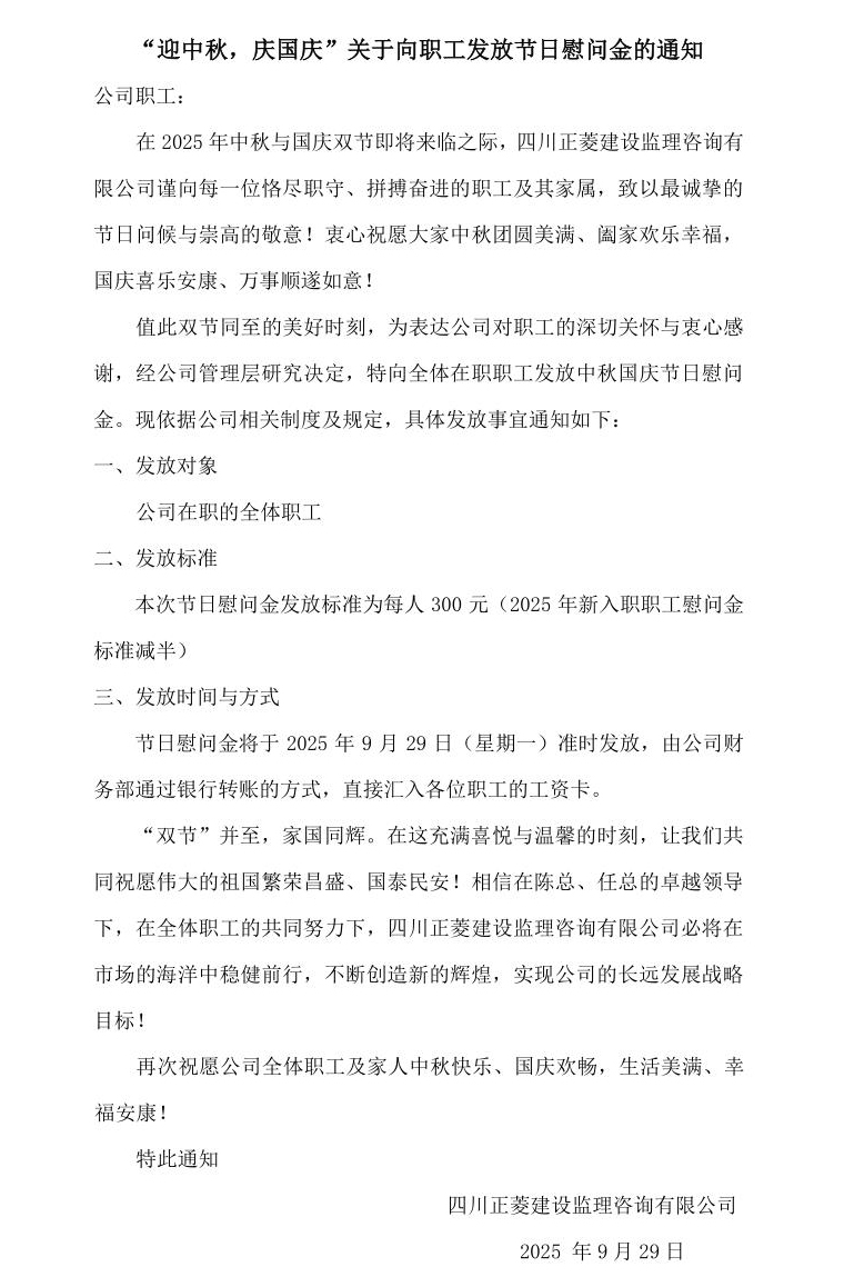 “迎中秋,庆国庆”关于发放节日慰问金的通知