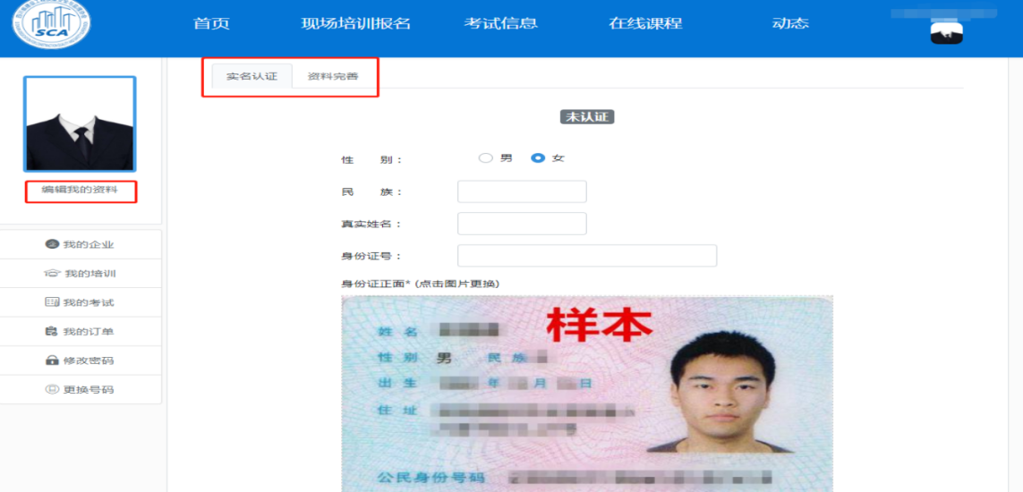 注册成功后方可登陆,通过右上角头像位置进入“个人中心”,或直接点击左侧“编辑我的资料”进入实名认证与资料完善界面,依次进行实名认证并完善资料(注:需保证资料填写准确无误)。